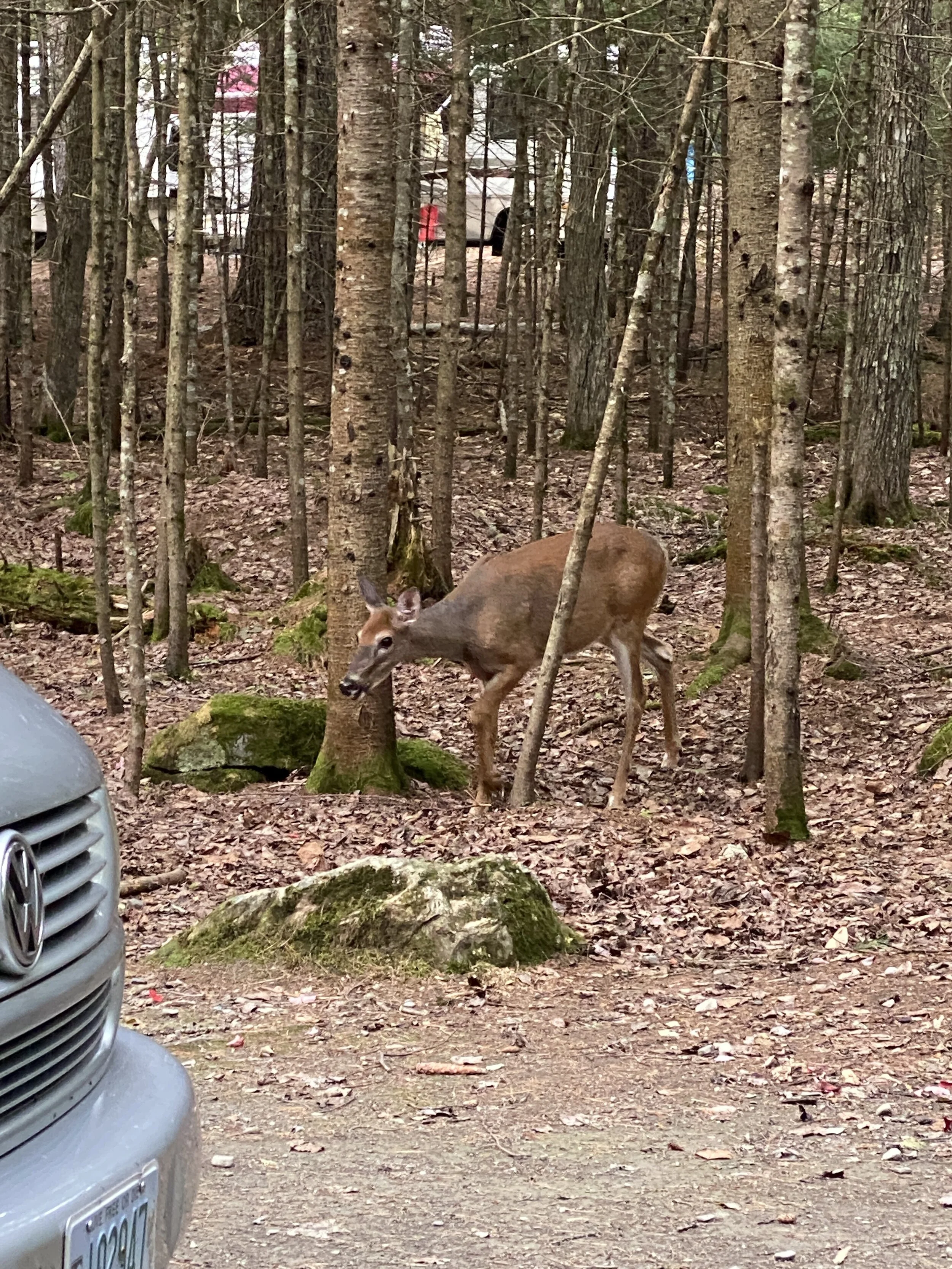 After spending a bit of time exploring the beachfront area, we relaxed in our hammocks. Just as I was starting to get a fire going, I noticed a swarm of bugs around the concrete base of the fire pit—tons of them, and I couldn’t tell what kind of bugs they were at first glance. A quick Google search (yay for having cell service!) told me they were most likely flying ants. I sprayed some water around the base of the fire pit, which helped, and they didn’t seem to return the next day. So weird. No sooner did I finish playing exterminator that something caught my eye from the campsite across the way—a deer was hanging out probably only 10 feet or so from the campers. The woman was tossing it food (a no-no), and then after 10-15 minutes, the deer came over and paid us a visit. We didn’t offer any food, and so it didn’t linger for too long, but at one point, it came close enough for G to pet (he didn’t). It was gorgeous—a much more welcome visitor than the flying ants!