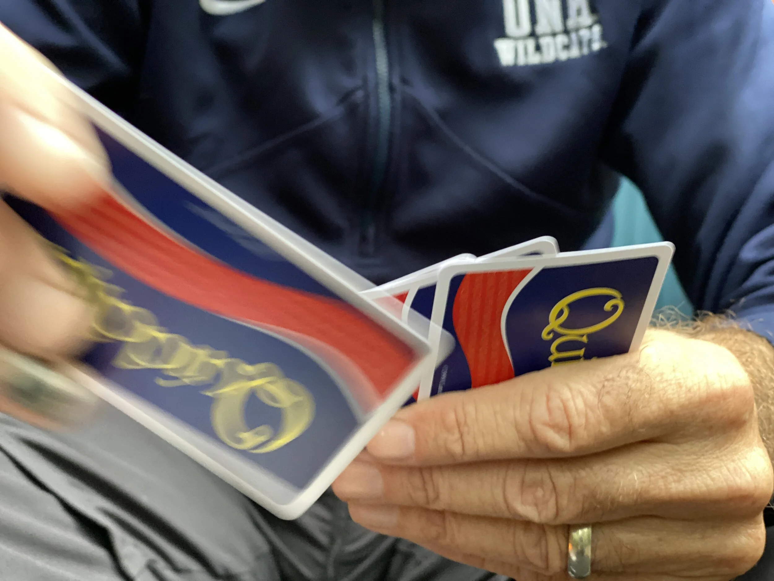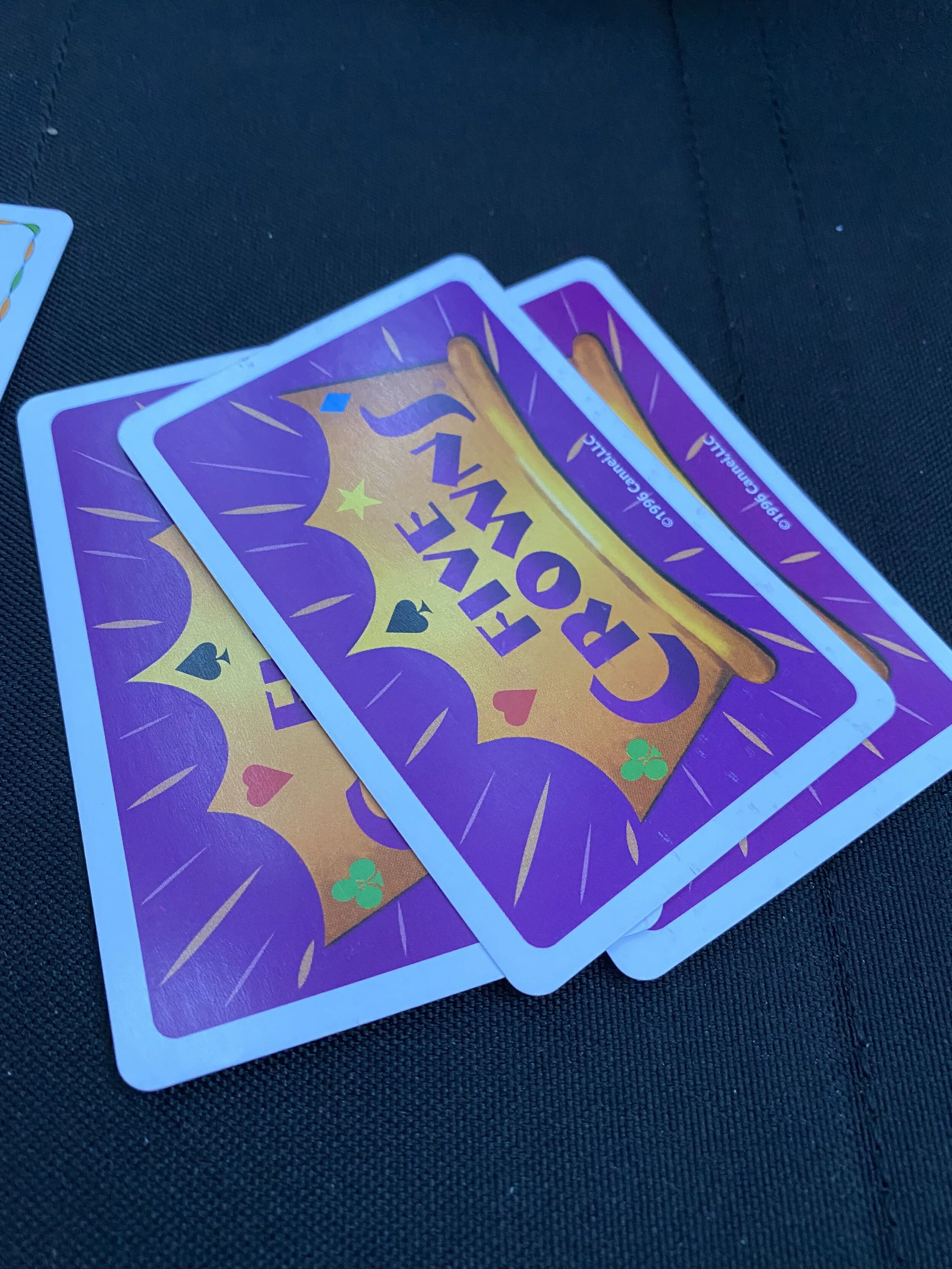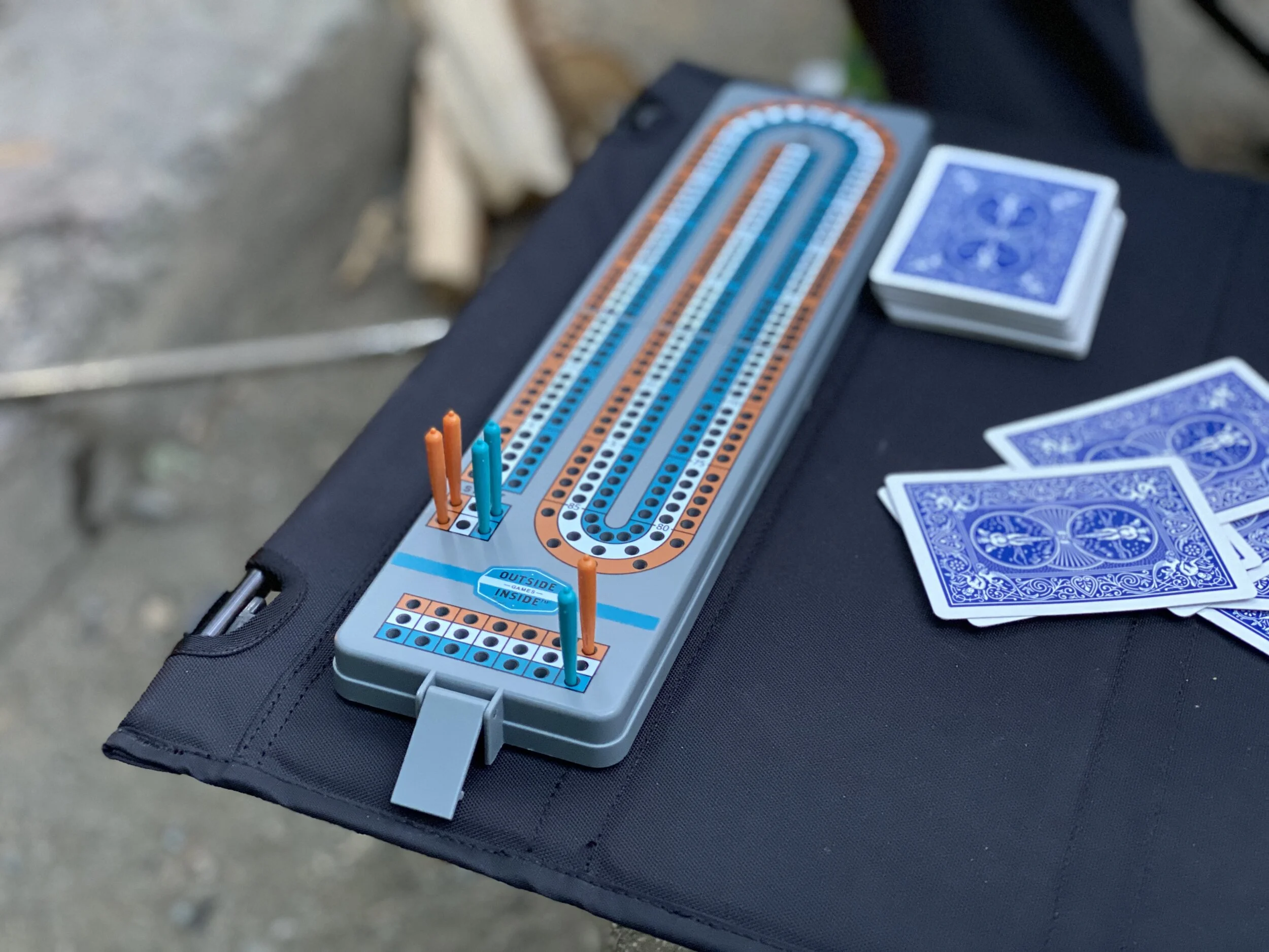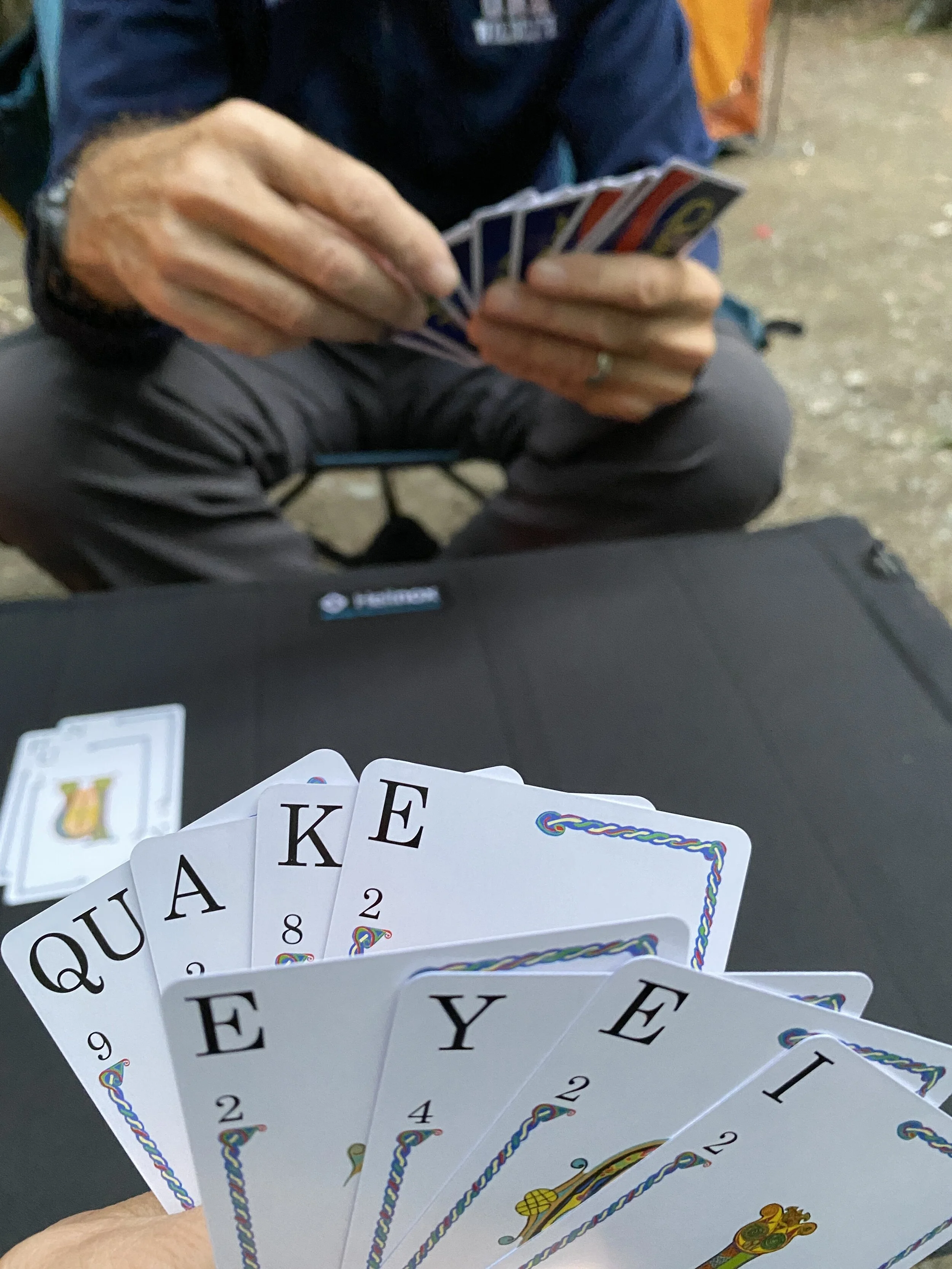 We again resumed our game-playing and opted for a few games of cribbage, followed by a few rounds of Five Crowns, made by the same makers of Quiddler. Five Crowns is a rummy-style game, with the goal of making “runs” (a sequence of three or more cards of the same suit) or “books” (three or more cards of the same value, regardless of suit). You play 12 rounds, with the number of cards dealt determined by the round. For example, in the first round, three cards are dealt; in the second, four cards. For more on the game and scoring, check out the rules here.