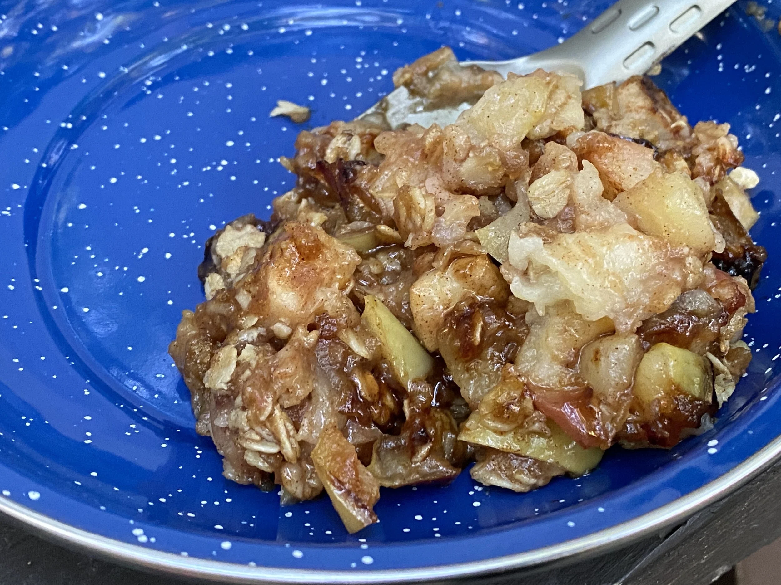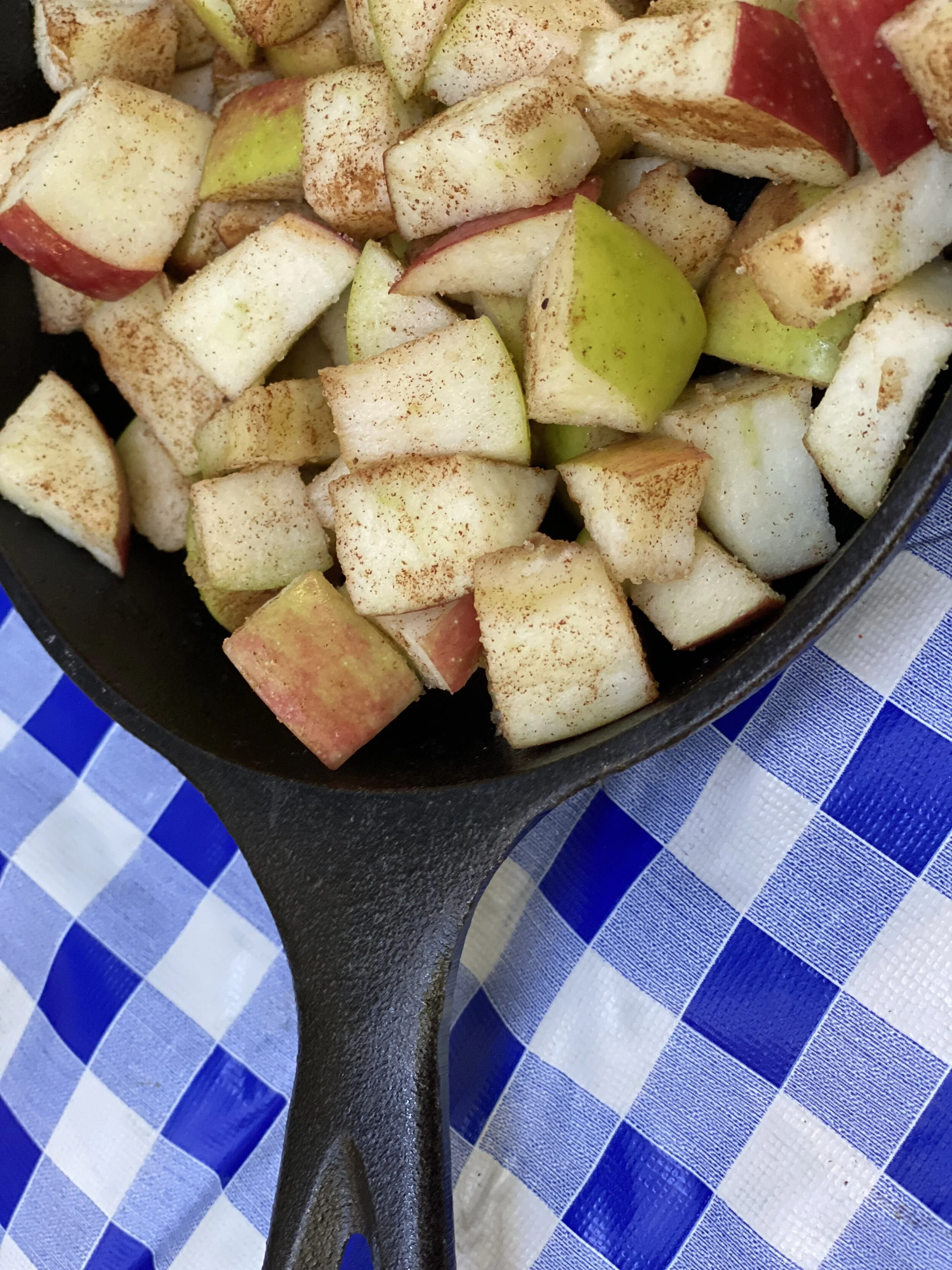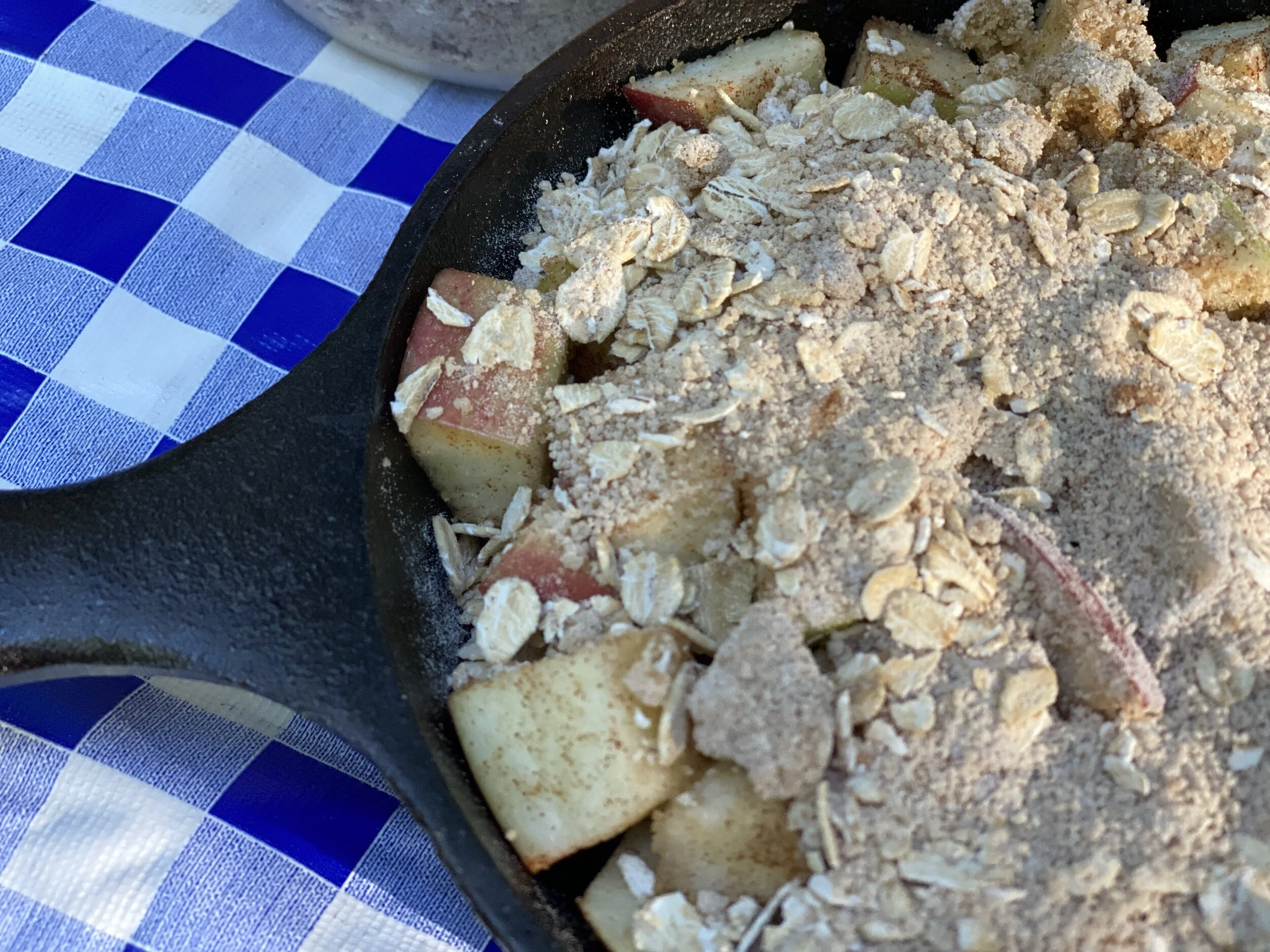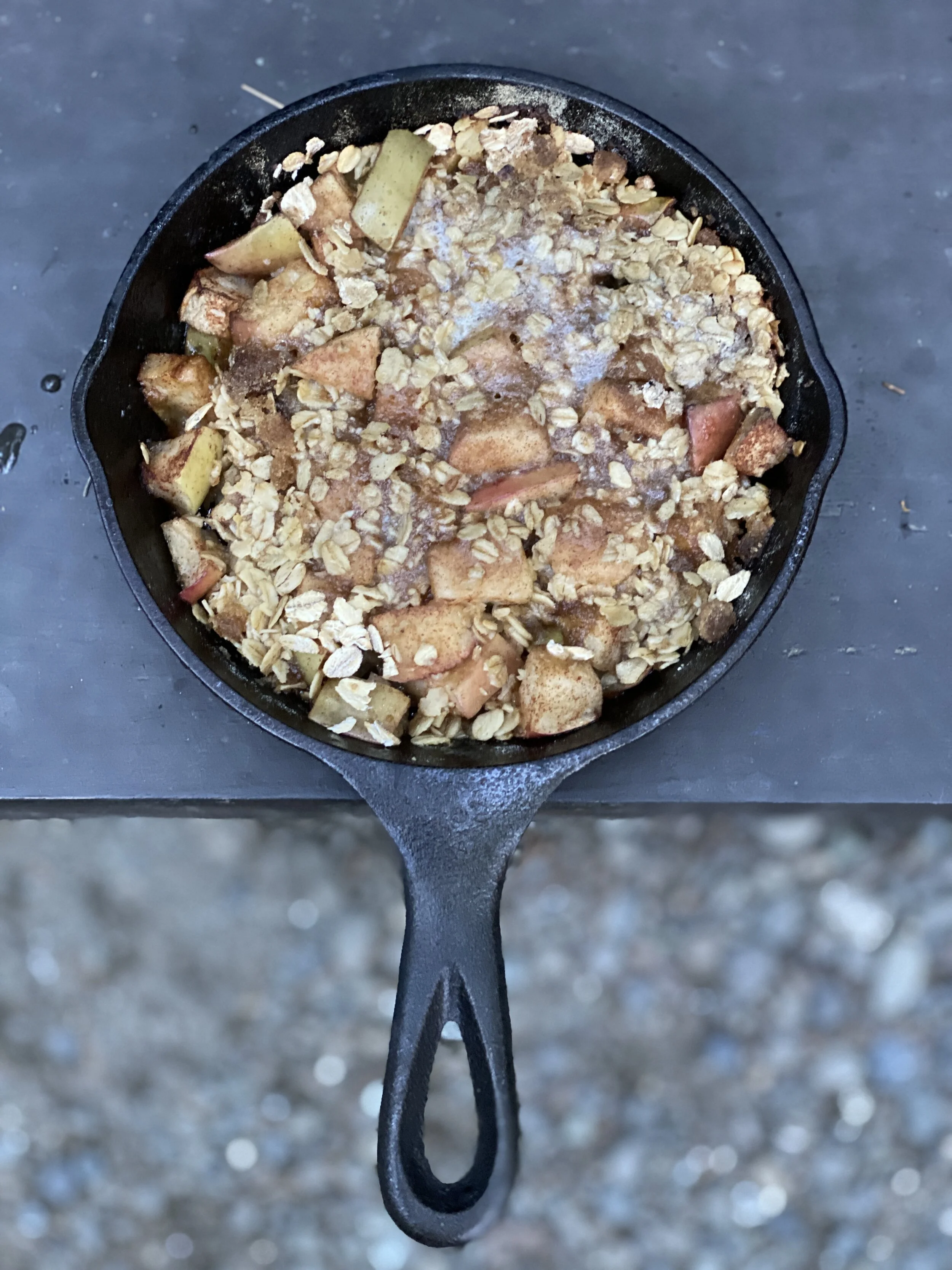 For dinner, we stayed with our tried-and-true buffalo chicken recipe (make chicken in InstantPot, shred, mix with generous amounts of Frank’s Red Hot Buffalo Sauce and bleu cheese dressing. Voila!) but instead of using the pie irons (a weekend with using the pie irons???!!!), I made them slider-style, with Hawaiian sweet dinner rolls. I had made the buffalo chicken at home and then heated up the mixture in a Lodge cast iron mini skillet over the fire. Then, once the chicken was warmed up, I assembled the sliders, topping each with a slice of smoked Gouda. Yum. But wait—it gets better—apple crisp!! Seriously, nothing says fall like apple crisp. I packed a few apples we had bought a few days earlier at our local orchard, chopped them up, tossed them with a little bit of sugar and cinnamon, added the oat-brown sugar-flour-cinnamon mixture (mixed at home and packaged separately), and topped with butter. I used another one of our mini cast iron skillets (perfect for making enough for just the two of us), and set that on the fire. So, so good—and so, so easy!