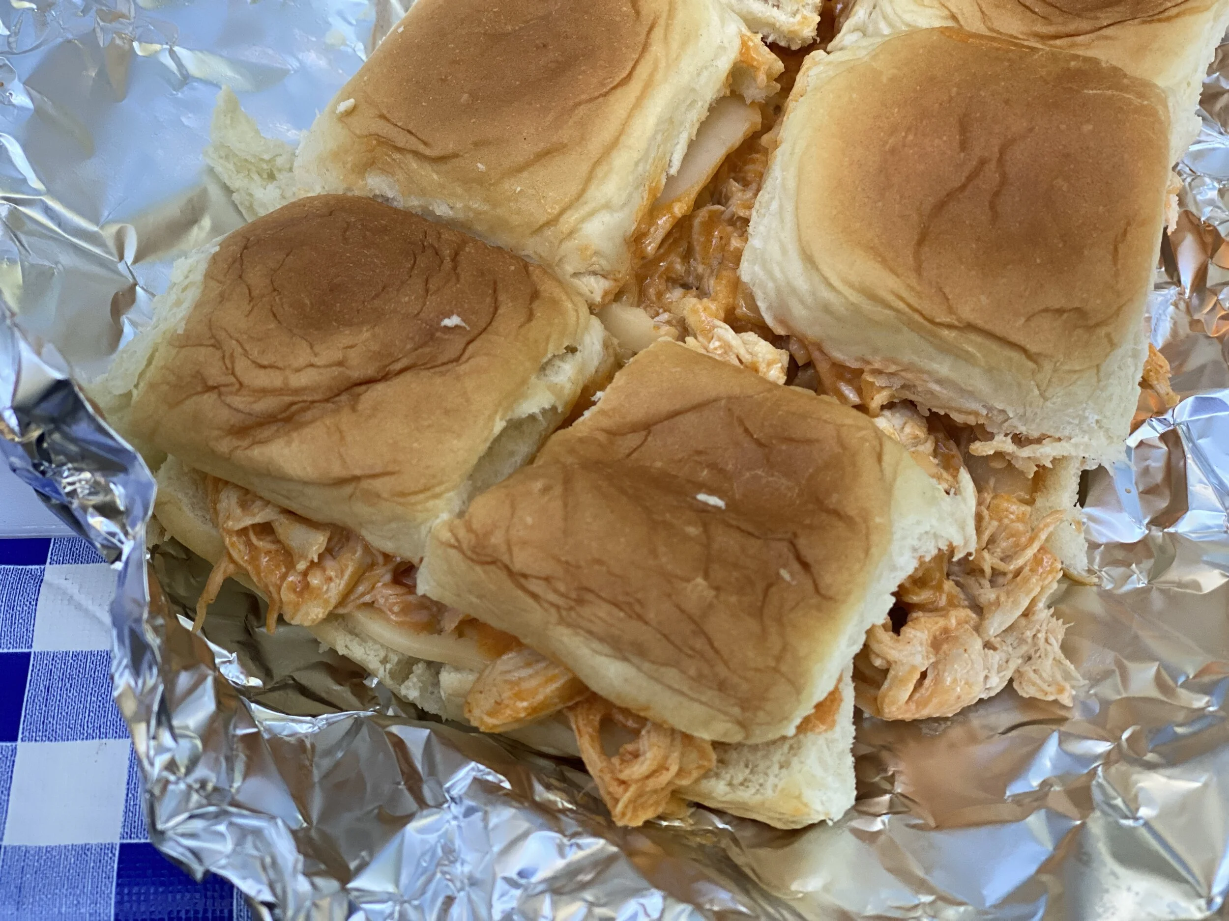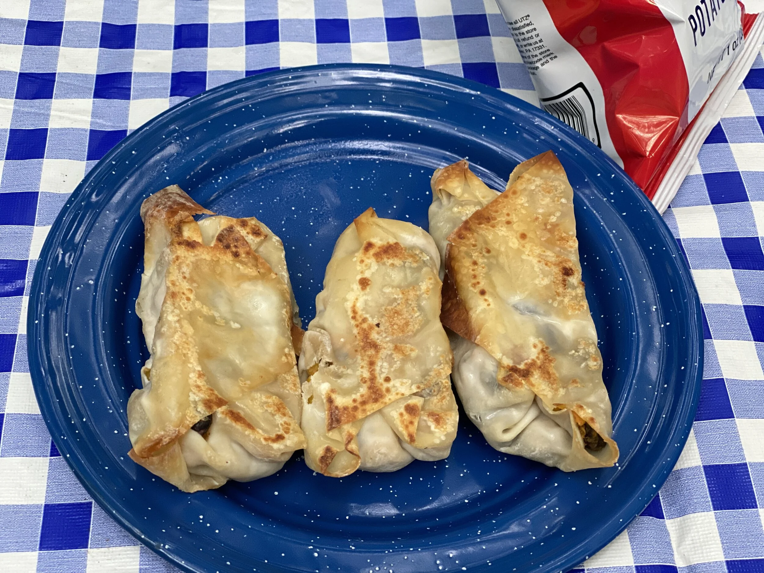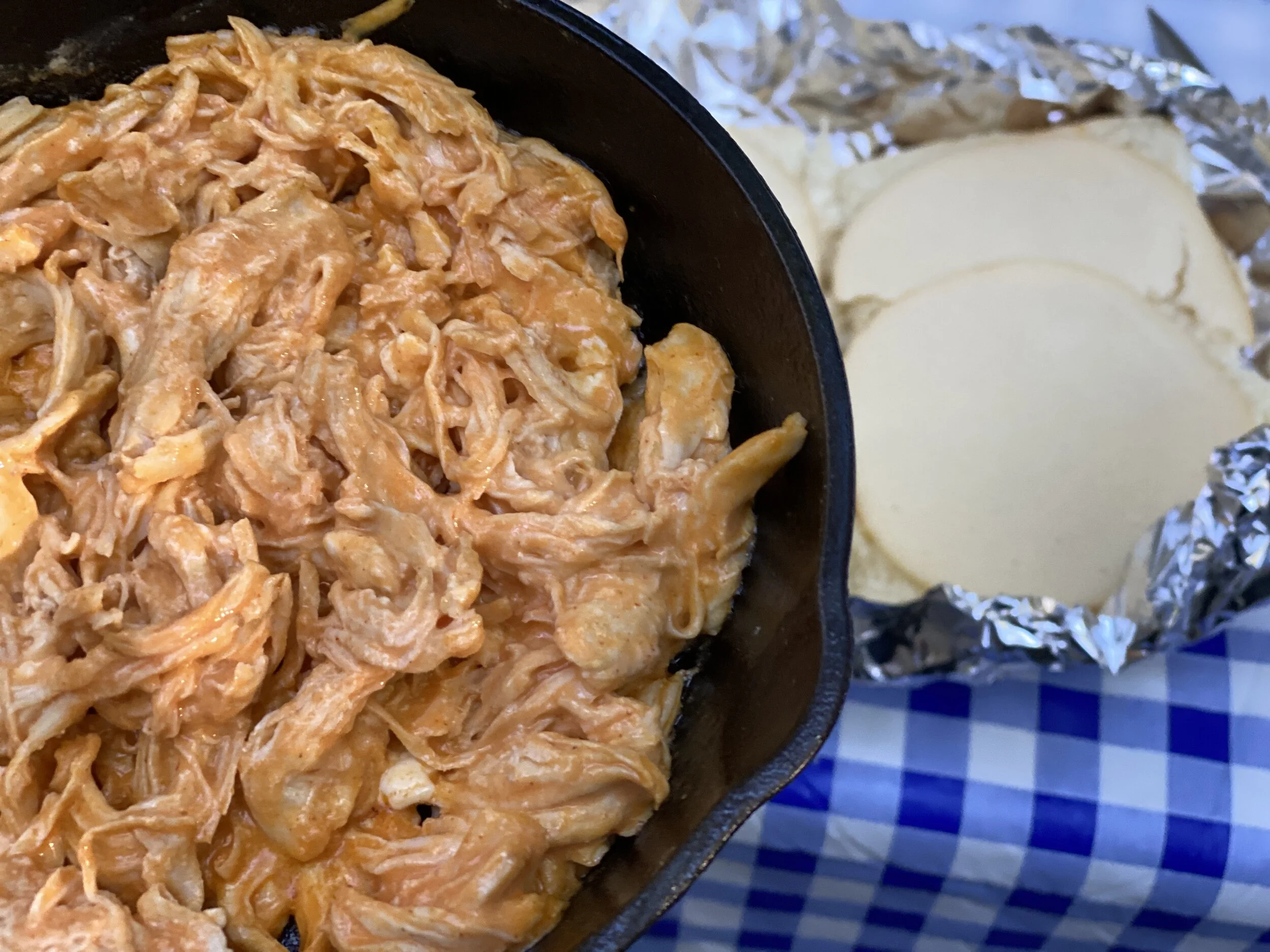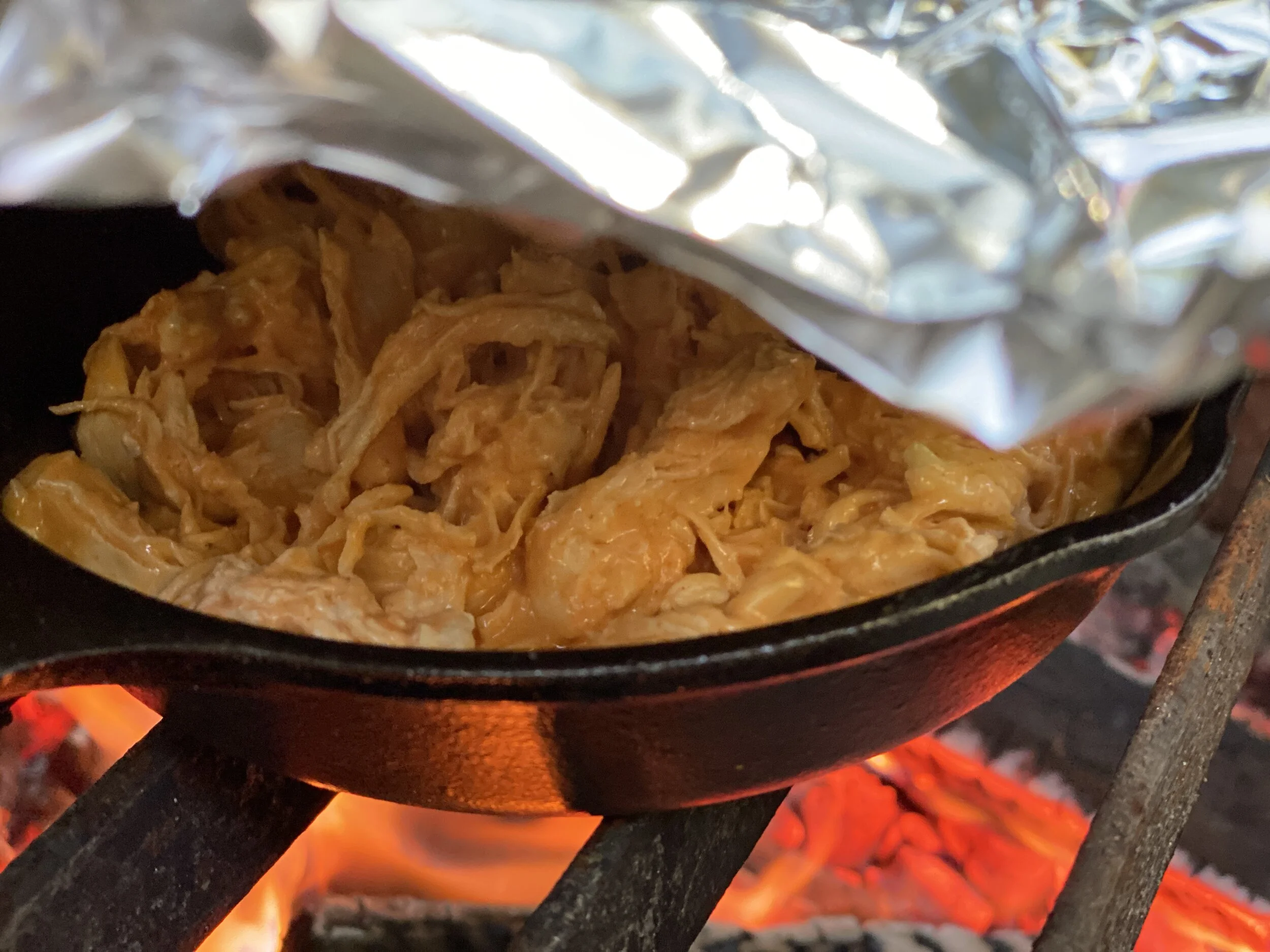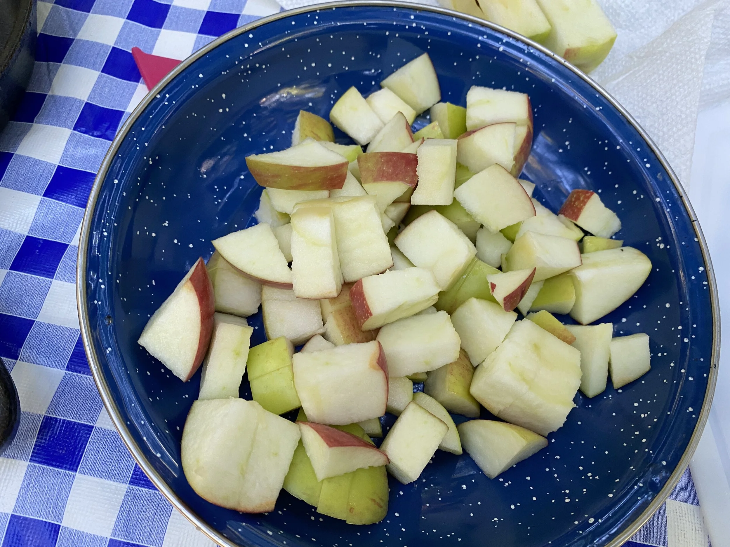 For dinner, we stayed with our tried-and-true buffalo chicken recipe (make chicken in InstantPot, shred, mix with generous amounts of Frank’s Red Hot Buffalo Sauce and bleu cheese dressing. Voila!) but instead of using the pie irons (a weekend with using the pie irons???!!!), I made them slider-style, with Hawaiian sweet dinner rolls. I had made the buffalo chicken at home and then heated up the mixture in a Lodge cast iron mini skillet over the fire. Then, once the chicken was warmed up, I assembled the sliders, topping each with a slice of smoked Gouda. Yum. But wait—it gets better—apple crisp!! Seriously, nothing says fall like apple crisp. I packed a few apples we had bought a few days earlier at our local orchard, chopped them up, tossed them with a little bit of sugar and cinnamon, added the oat-brown sugar-flour-cinnamon mixture (mixed at home and packaged separately), and topped with butter. I used another one of our mini cast iron skillets (perfect for making enough for just the two of us), and set that on the fire. So, so good—and so, so easy!